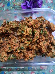 4).Drop small portions of this dough into medium hot oil and fry them till light golden in colour. Remove them on to a kitchen tissue.